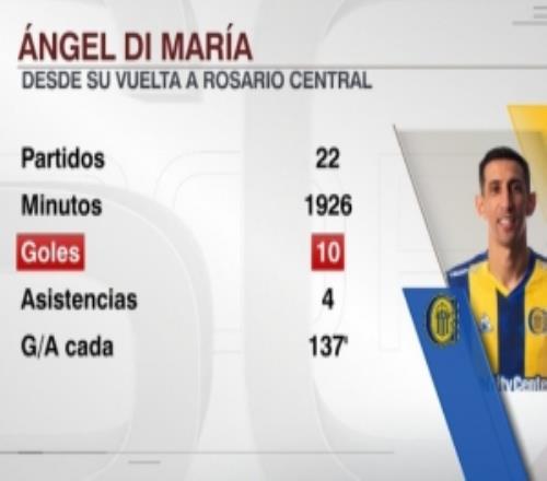 迪马利亚回归罗萨里奥中央以来22场10球4助,平均137分钟参与1球