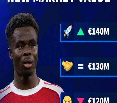 德转预热萨卡身价更新:最高涨至1.4亿欧,最低降至1.1亿