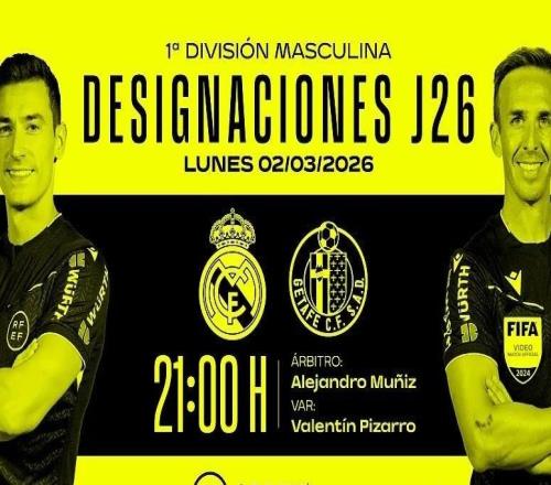 西班牙足协官方公布了周一西甲比赛裁判安排,亚历杭德罗-穆尼斯将执法皇马vs赫塔费。西甲第26轮最后一场比赛...