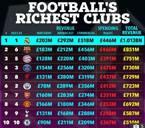 太阳报:曼联在足坛收入榜暴跌至第8,皇萨仁前三、利物浦第5