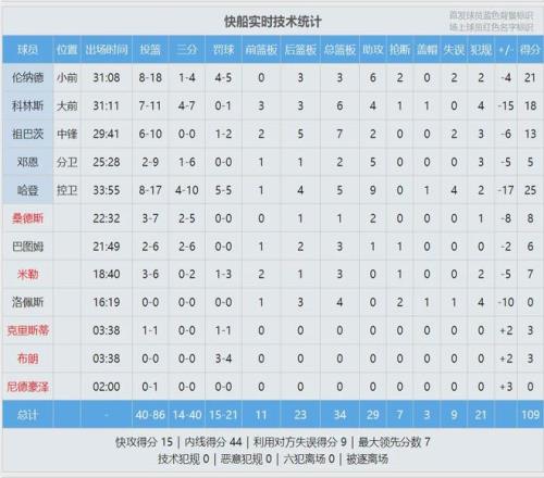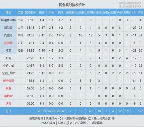 ¿ì´¬Àº°åÇò±È¾ò½ðÉÙÁË9¸ö£¬·£ÇòÉÙÁË11¸ö¡£¾ò½ðÈý·Ö28ÖÐ16£¬ÃüÖÐÂʸߴï57.1%¡£³ýÁËÔ¼ÀÏʦ£¬¾ò½ð»¹ÓÐÈýÈË20+£ºÐ¡¹þ´ïÍþ22·Ö¡¢ÎÖÌØÉ21·Ö4°å3Öú¡¢ÄÂÀ×20·Ö4°å9Öú¡£¹þµÇ25·Ö5°å9Öú¡¢Â×ÄɵÂ21·Ö3°å6Öú¡¢¿ÆÁÖ˹18·Ö6°å4Öú¡£