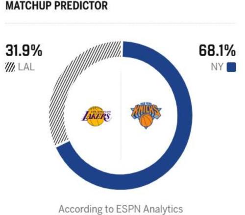 反观湖人战绩为29胜18负位列西部第六,场均得分116.5联盟第14,场均失分116.4分联盟第19,上一场他们142-111大胜奇才,东契奇砍下37分11篮板13助攻的高光数据,而詹姆斯贡献20分,艾顿贡献28分13篮板。本场比赛是湖人与尼克斯的首次交手,上赛季两队交战两次,湖人都拿到胜利。本赛季,湖人角色球队发挥不稳定,但东契奇和詹姆斯的表现亮眼,不过,尼克斯从阵容深度上更胜一筹,加上尼克斯主场战绩19胜6负,ESPN的数据模型给出湖人赢球概率只有32.9%。