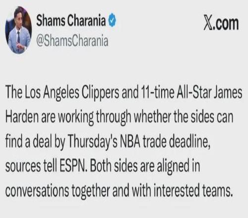 爆料王Shams:快船和哈登准备分道扬镳,双方正在进行沟通,并且都与感兴趣的球队进行了对话。