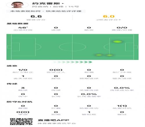 ÌåÓý²¥±¨2ÔÂ4ÈÕÐû ÁªÈü±°ë¾öÈü´Î»ØºÏ£¬°¢ÉÄÉÖ÷³¡ÓÕ½ÇжûÎ÷¡£Ô¼¿ËÀ×˹Ê×·¢³öÕ½£¬Éϰ볡ֻÓÐ3´Î´¥Çò£¬1´ÎÉäÃÅûÓÐÉäÕý£¬ÆÀ·Ö6.6¡£