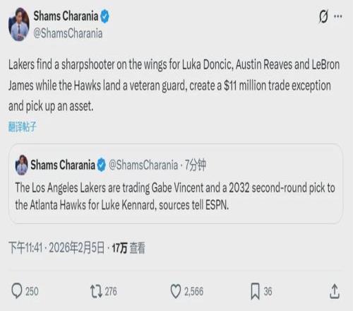 根据ESPN名记Shams报道,湖人与老鹰完成2换1交易,湖人将文森特和2032年次轮签送至老鹰,换回神射手肯纳德,有望提...