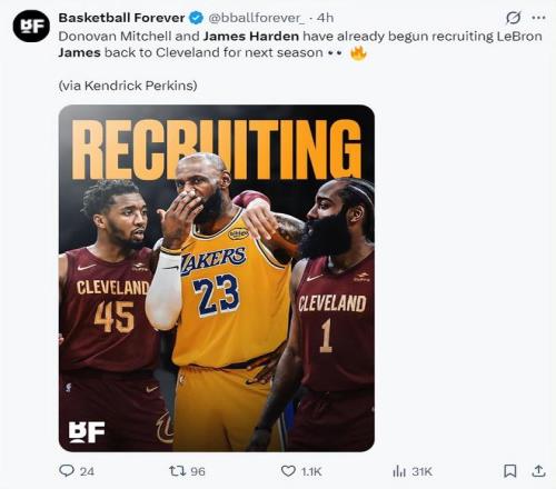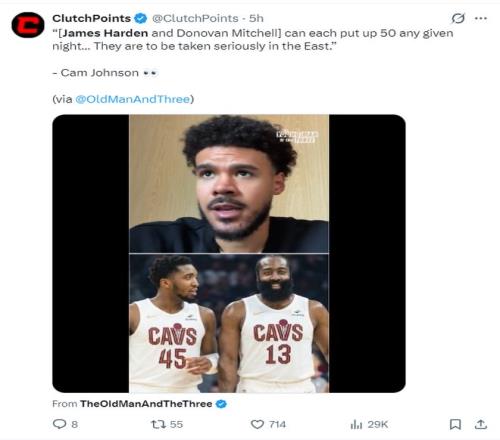 掘金球员卡梅伦-约翰斯在直播时谈到哈登+米切尔的组合,他表示:骑士队会变得非常强大,因为哈登、米切尔两人都是可以一场50+的球员,米登组合会非常之恐怖。