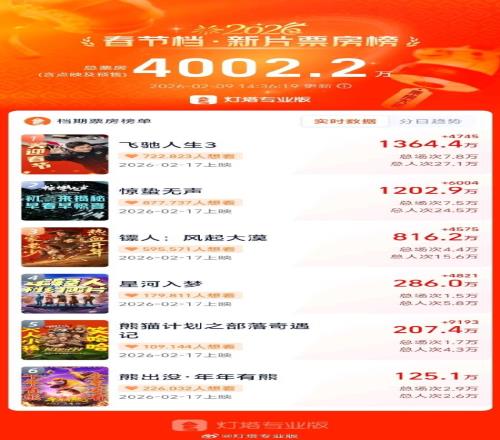体育播报2月9日宣2026年春节档预售正式开启后热度持续攀升,据灯塔专业版数据,截至今天14时,春节档新片预售总票房已突破4000万。