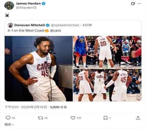 赛后,米切尔发推写道:“西部客场之旅4胜1负。”哈登转发了这条动态,并配上了一个