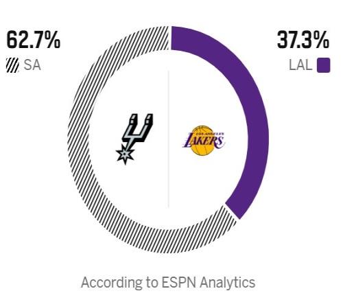 ESPN预测本场胜率,湖人37.3%,马刺62.7%。
