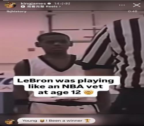 詹姆斯在今日比赛前转发了网络上流出的1997年他12岁时参加一项青少年篮球锦标赛的录像集锦,并评论道:“年轻的