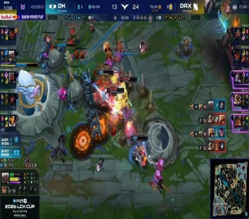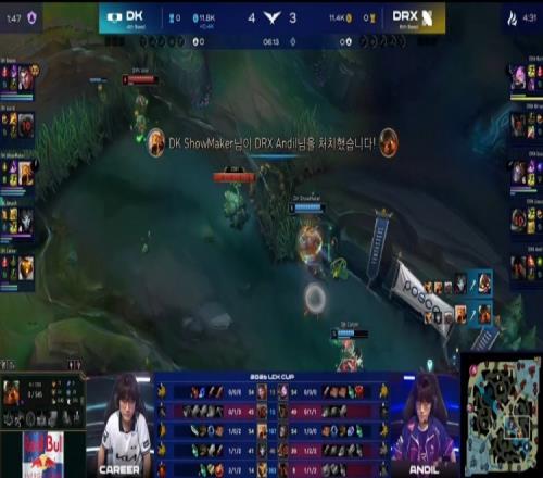 中期Lucid安蓓萨入侵被抓,Siwoo杰斯接连阵亡,DRX河道团打出0换2并推掉DK中一塔,经济领先1k。紧接着小龙团DRX再打1换3,将差距扩大到2k。