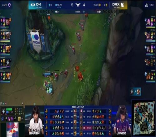 【16:49】Lucid安蓓萨入侵DRX石头人被逮捕,Andil泰坦点火吃掉人头,随后Siwoo杰斯下路推塔被DRX下野二人击杀,双方经济持平。