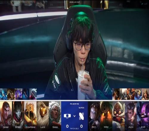 第一局前期下路对拼,Smash烬与Career巴德越塔打出1换1。随后Andil泰坦钩杀Smash烬,下河道4v4,Lucid安蓓萨配合ShowMaker沙皇打出1换3,双方经济差距在1k内。