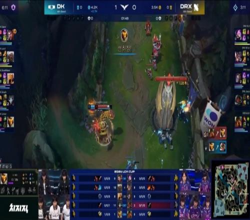 【18:35】河道团战,Lucid安蓓萨独自进场先被融化,Siwoo杰斯中路被钩再送人头,许哥沙皇不在正面DK就被开团,DRX打出0换2推掉DK中路一塔,经济领先1k。