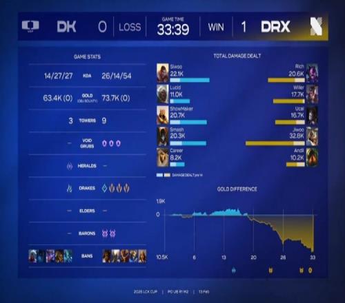 后续上河道4v4,DRX击杀DK中野并拿到大龙,经济领先4.5k。随后DRX中路推进打出2换4并收下土龙魂,再控大龙领先8.5k。最终DRX推平DK基地,先下一城。