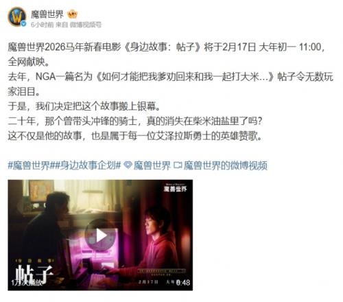 体育播报2月15日宣今日,《魔兽世界》官方微博发布了2026年新春电影《身边故事:帖子》的预告篇,电影将于2月17日大年初一11:00全网热映。