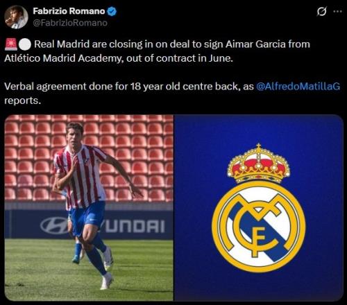 罗马诺写道:“皇马接近敲定马竞青训后卫艾马尔·加西亚,他与马竞的合同将在6月份到期,皇马已经与这位18岁中卫达成口头协议。”