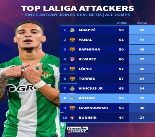 在曼联经历低谷之后,安东尼在贝蒂斯重振了自己的职业生涯。本赛季到目前为止,他各项赛事代表贝蒂斯出战29场比赛,打进10球送出9次助攻。