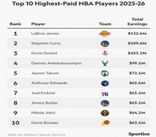 ±±¾©Ê±¼ä2ÔÂ21ÈÕ£¬ÃÀýSportico¹«²¼2025-26Èü¼¾NBA×ÜÊÕÈ루NBAÄêн+³¡Íâ´úÑÔÊÕÈ룩×î¸ßǰʮÇòÔ±°ñµ¥£¬Õ²Ä·Ë¹ÒÔ1.326...
