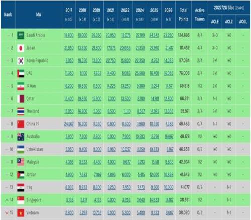 本赛季东亚区亚足联积分排名