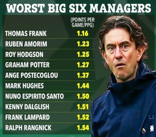 另一份统计用的是“联赛每场平均能拿到多少分”这个口径,把近些年“六强球队主帅里平均拿分偏低的一批”列出来,阿莫林的数字被放在靠后的位置。这样的表会引发争议,原因也很现实:它不讨论过程,只统计联赛长期拿分能力;当平均拿分长期处在偏低区间,赛季目标就会被一轮轮的丢分拖住。