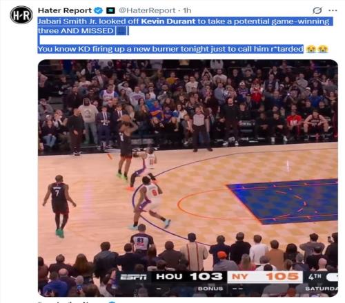 如果没有看比赛,大家会认为小贾巴里-史密斯、凯文-杜兰特两人在关键时刻一人投丢了一个关键球,但看了比赛的球迷就知道杜兰特决胜时刻的表现堪称战犯。