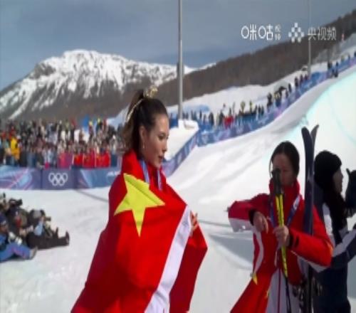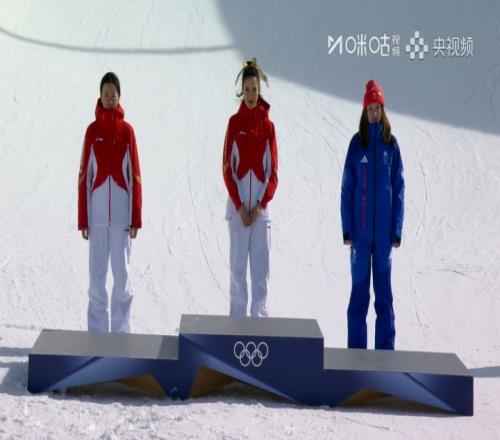 荣耀加冕!谷爱凌头戴金色头纱领取金牌,与李方慧身披国旗庆祝
