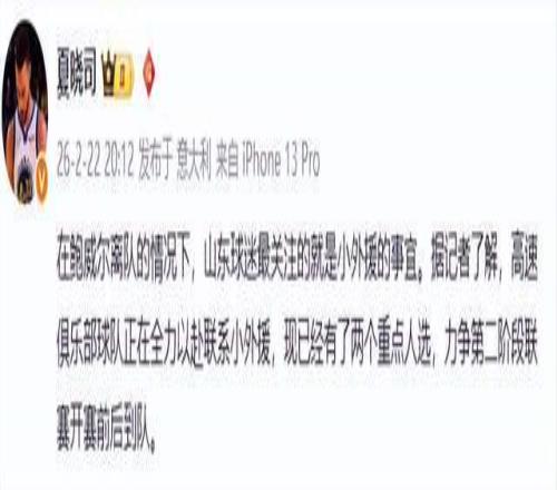 至于小外援?根据山东媒体人夏晓司的报道,山东男篮俱乐部已锁定两名重点目标,正全力推进签约,目标明确:第二阶段开赛前,必须到位。
