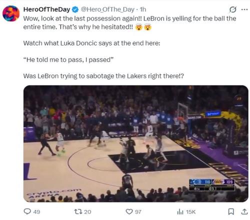 詹姆斯赛后也表示,东契奇应该投那是一个空位,传给我时有点失去平衡了。