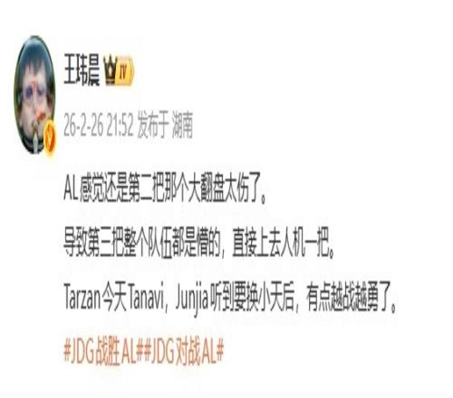 体育播报2月26日宣 LPL第一赛段季后赛JDG 3-2 AL,媒体人王玮晨赛后锐评: