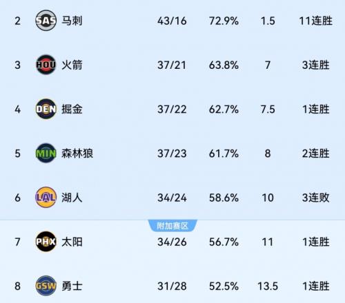今日过后,西部3—8仅洛杉矶湖人处于连败状态!