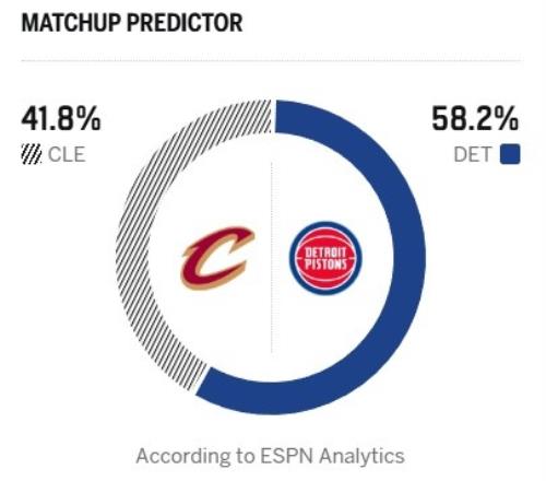今天ESPN给出了本场胜率预测,骑士为41.8%,活塞58.2%占上风。