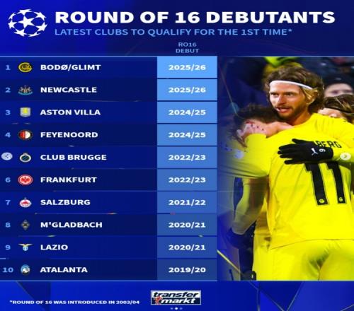 体育播报2月27日宣 本赛季欧冠淘汰赛抽签在即,德转盘点了近10支首次晋级欧冠16强的球队(自03/04赛季赛制改革之后),具体如下: