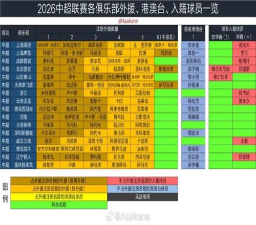 ¸ù¾ÝÖìÒÕ·¢²¼µÄ»ã×ÜÐÅÏ¢£ºËùÓÐÇò¶Ó¾ùÓÃÂúÁËÍâÔ®Ãû¶î£¬ÆäÖÐÉϺ£º£¸Û¡¢ÉϺ£É껨¡¢±±¾©¹ú°²ºÍÌì½ò½òÃÅ»¢Ê¹ÓÃÁË»ú¶¯µÄµÚÁùÍâÔ®Ãû¶î£¬Íâ¼®ÇòÔ±×¢²á×ÜÊýΪ£¨16*5+4=£©84ÈË£¬ÆäÖÐ45ÈËΪÐÂÍâÔ®£¬39ÈËΪÁôÓÃÍâÔ®¡£´ËÍ⣬16Ö§Çò¶ÓÖÐÓÐ13Ö§×¢²áÁ˸۰Ą̈ÇòÔ±¡£