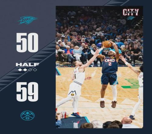 亚历山大第二节6中4独得10分2盖帽,但雷霆全队上半场三分只有15中4。小哈达威成为掘金奇兵,上半场三分4中4独得12分,一个人的三分命中数和雷霆全队持平。但穆雷迷失了,上半场投篮8中2拿到8分,雷霆单节31-26追回5分。