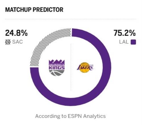 ESPN预测本场胜率:湖人75.2%,国王24.8%。