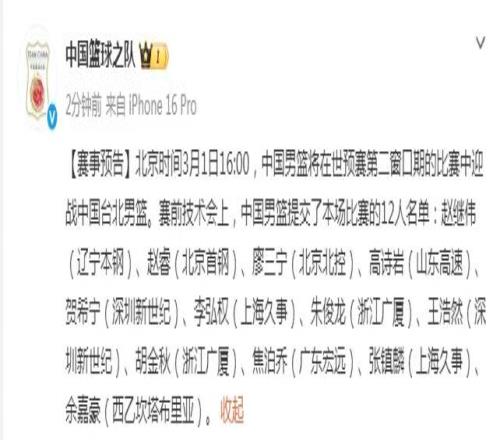北京时间2月28日,中国篮球之队官方公布对阵中国台北男篮的12人阵容名单,与上一场对阵日本男篮的12人阵容保持不变。至于中国台北男篮的12人阵容存在变化,即用后卫游艾喆顶替受伤的前锋马建豪。中国男篮过往赛会交锋11胜1负,需谨防重蹈2013年“马尼拉惨案”重演。