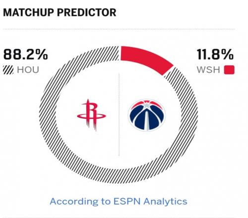 小贾缺阵!虐菜局ESPN预测明日胜率:火箭88.2%奇才11.8%