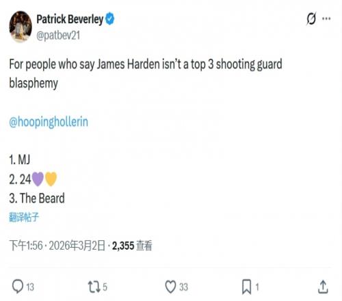 “那些说哈登不是历史前三分卫的人是在亵渎神明,1乔丹2科比3哈登。”贝弗利写道。