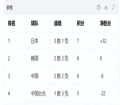 µÚÒ»ÃûÊÇ3ʤ1¸º»ý7·Ö£¬¾»Ê¤·Ö+32µÄÈÕ±¾¶Ó£»µÚ¶þÃûΪ2ʤ2¸º»ý6·Ö£¬¾»Ê¤·ÖΪ0·ÖµÄº«¹ú¶Ó£»µÚÈýÃûΪ2ʤ2¸º»ý6·Ö£¬¾»Ê¤·ÖΪ-6·ÖµÄÖйú¶Ó£»µÚËÄÃûΪ1ʤ3¸º»ý5·Ö£¬¾»Ê¤·ÖΪ-22µÄÖйų́±±¶Ó¡£