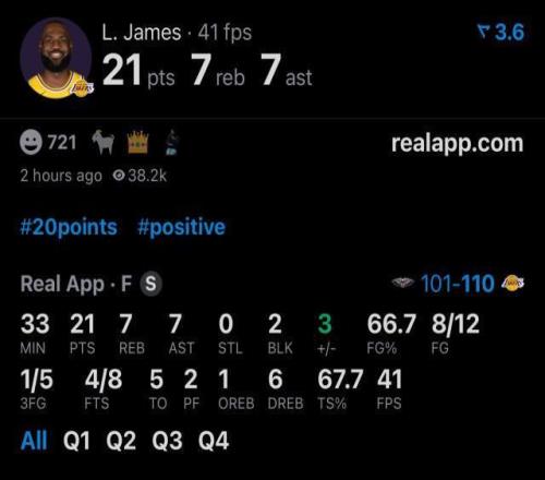 此役之前,詹姆斯常规赛生涯总进球数为15827记,历史第一的贾巴尔为15837记,最终詹姆斯本场12中8得到21分7篮板7助攻,距离追平贾巴尔只差2球,登顶一刻大概率将在下一场对阵掘金的比赛上演。