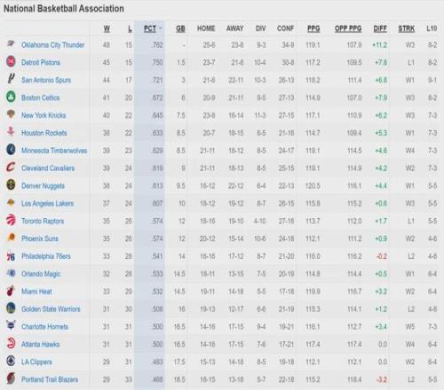 北京时间3月4日,NBA常规赛:雷霆116-108战胜公牛,活塞109-113不敌骑士。截至目前,雷霆48胜15负重返联盟第一,活塞45胜15负跌至联盟第二。雷霆被活塞压制了20天,现在终于登顶了。马刺44胜17负,依然位列联盟第三。