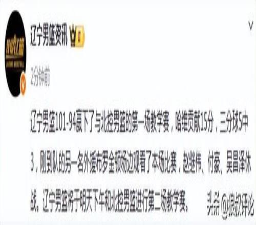 根据辽宁博主的报道,辽宁男篮101-94赢下了与北控男篮的第一场教学赛,哈维贡献15分,三分球5中3,刚到队的另一名外援布罗金顿场边观看了本场比赛,赵继伟、付豪、吴昌泽休战。辽宁男篮将于明天下午和北控男篮进行第二场教学赛。