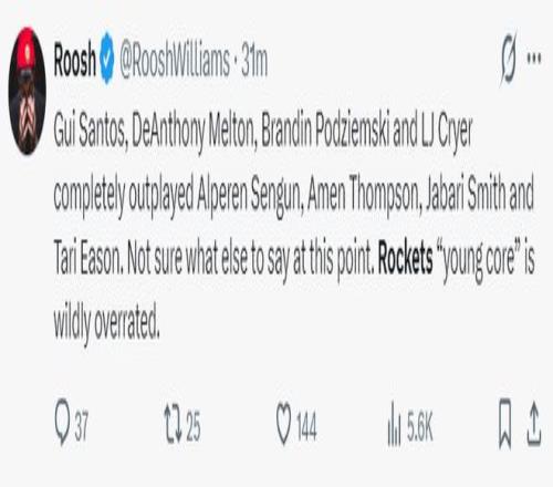 休媒:桑托斯、梅尔顿、波杰姆斯基、克莱尔的表现完全超过了申京、阿门、小贾、伊森,此刻我都不知道说什么好,我们火箭的年轻核心们明显被高估了。