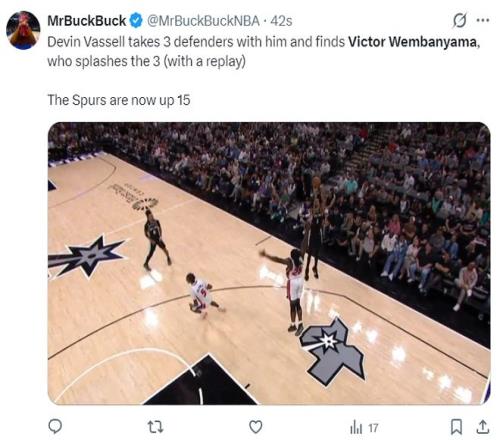 这场比赛文班亚马又打出了炸裂的表现,在一次挑篮没有命中后,他面对两人直接补扣成功,文班亚马这个身体天赋实在是太强悍了。首节6中4+三分3中2拿到12分3篮板3盖帽。