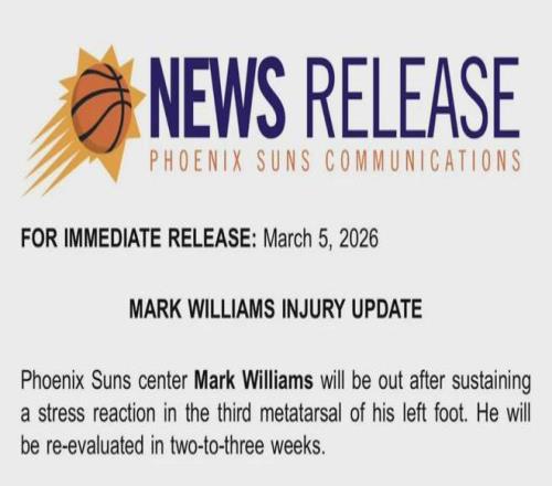 Ì«Ñô¹Ù·½Ðû²¼£ºÂíÍþ×ó½ÅµÚÈýõŹdzöÏÖÓ¦Á¦·´Ó¦£¨¹Ç÷À¹ý¶ÈʹÓÃËðÉ˵ÄÔçÆÚ½×¶Î£©£¬Á½µ½ÈýÖܺóÖØÐ½øÐÐÆÀ¹À¡£