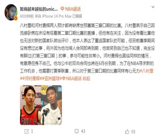 ÖÁÓÚÈÕ±¾ÄÐÀºµÄºó³¡ºËÐÄÇòÔ±ºÓ´åÓ»ÔÒ²ÊÇÀàËÆµÄÇé¿ö£º¡°ºÓ´åÓ»ÔÒ²ÃæÁÙͬÑùµÄÇé¿ö£¬ÓÐÒâÔ¸µ«Éí²»Óɼº¡£ËûÓ빫ţµÄË«ÏòºÏͬҲ½«ÔÚ6Ô·ݵ½ÆÚ£¬ÎªÁËÔÚNBAѰÇóÐµĹ¤×÷»ú»á£¬ËûÐèÒª´òNBAÏļ¾ÁªÈü£¬ËùÒÔ¶ÔÓÚµÚÈý´°¿ÚÆÚµÄ±ÈÈü£¬Í¬ÑùÓÐÐÄÎÞÁ¦¡£¡±