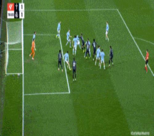 第11分钟,皇马战术角球开出,居莱尔倒三角回敲,琼阿梅尼推射弹柱入网,1比0。这是琼阿梅尼的联赛首球,也是皇马本场为数不多的亮点。