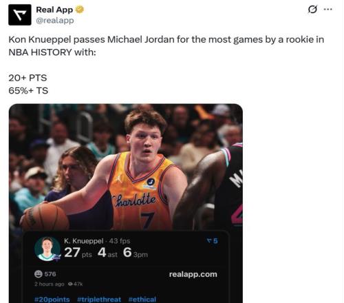 凭借这样的表现,克努佩尔本赛季已经27次单场交出至少20+得分且真实命中率至少为65%,打破乔丹1984-85赛季保持的NBA历史新秀纪录,而黄蜂本赛季还有18场常规赛要打,按照克努佩尔的状态,他势必将大幅提升这一纪录。