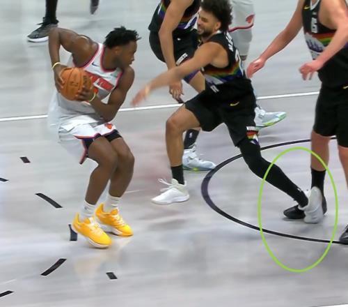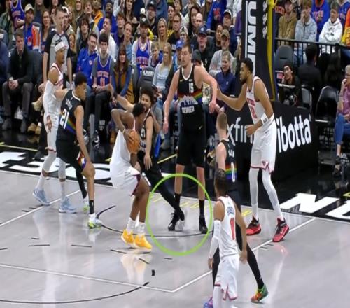 裁判第一时间吹罚尼克斯前锋OG-阿努诺比进攻犯规,尼克斯挑战成功后改判穆雷阻挡犯规,尼克斯得到两罚。